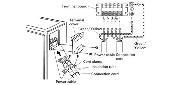 به منظور اتصال سیم های برق داکت اسپلیت باید برق تغذیه اصلی را به واحد خارجی (Outdoor unit) متصل کرده و سپس کابل ارتباطی یونیت خارجی به یونیت داخلی را متصل نمود. در شکل زیر نمونه ای از اتصال سیم ها به ترمینال های یونیت خارجی و یونیت داخلی نشان داده شده است.