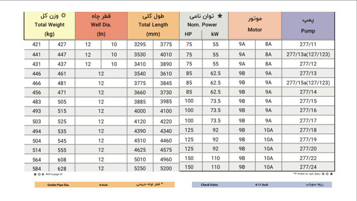 - کاربرد : تامین آب آشامیدنی، تامین آب فرآیندهای صنعتی، آبیاری، تخلیه آب معادن، جبران فشار (بوستر ) طرحهای آبرسانی ، پمپاژ از مخازن ، برداشت آب خام از رودخانه و دریاچه سدها ، برداشت آب از دریا ، برداشت آب از چاههای عمیق، نیمه عمیق و آتش نشانی. .