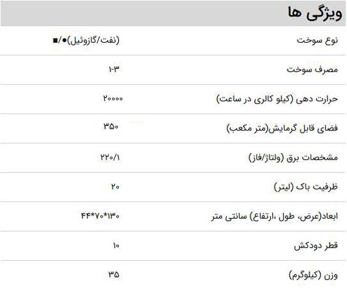 - مصرف سوخت: میزان مصرف سوخت این دستگاه به ظرفیت کاری و نوع سوخت بستگی دارد؛ بنابراین بهتر است پیش از خرید، میزان نیاز گرمایی محیط خود را بررسی کنید.