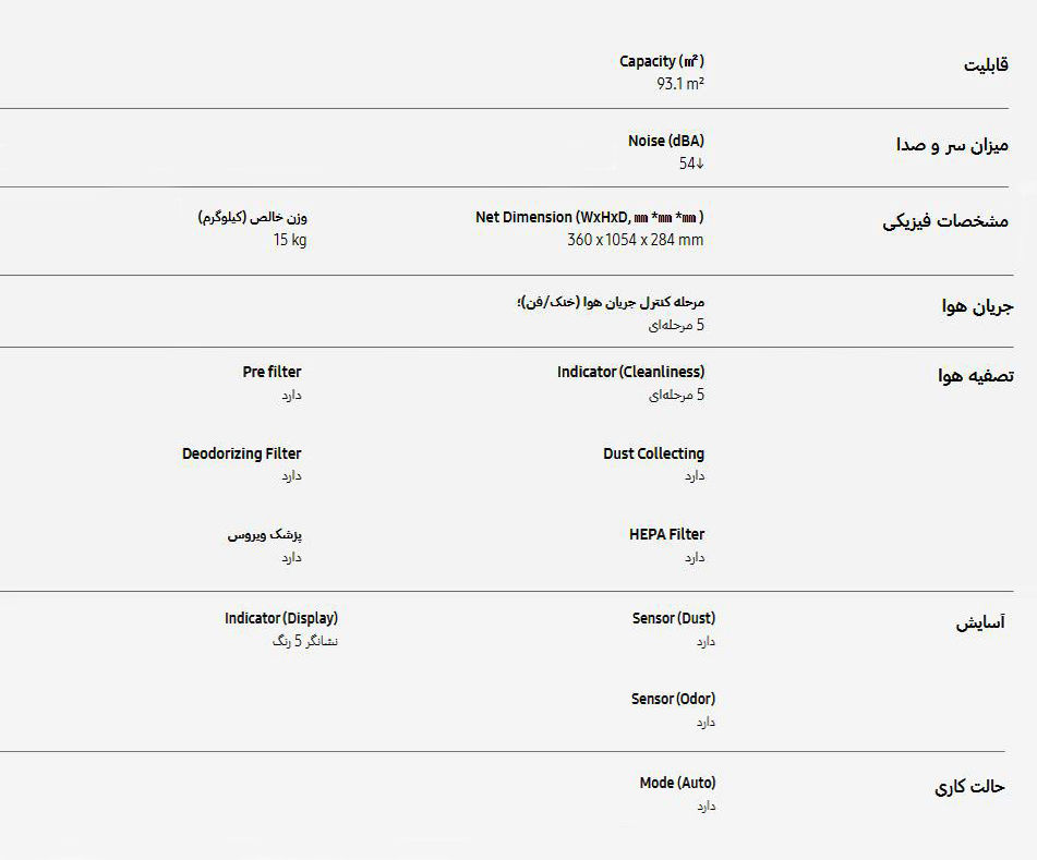 • قابلیت : دکتر ویروس - تصفیه چهار مرحله ای - نمایشگر کیفیت هوا - ذرات فوق ریز و گازهای مضر را تا ‎ 99.9% حذف می‌کند و ویروس‌ها و ذرات آلرژی‌زا را تا ‎ 99.7% از بین می‌برد .