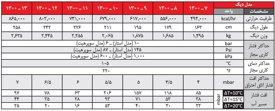 بوده و حداکثر دمای کاری در دیگهای ۱۳۰۰ به میزان ۱۰۵ درجه سانتیگراد و قابلیت تحمل حداکثر فشار کاری ۱۰ بار معادل ۱۴۵ Psi و ۱۰۰۰ کیلو پاسکال را