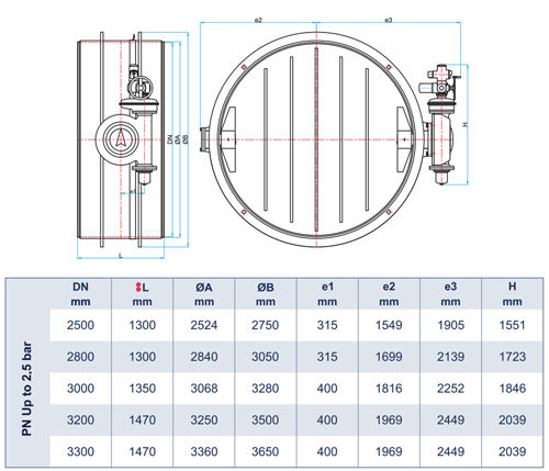 حداکثر فشار کاری در شیر پروانه ای با اتصال جوشی در سایز 2800 میراب، 2.5 بار می باشد که برای سیالاتی تا دمای 120 درجه سانتیگراد قابل استفاده هستند.