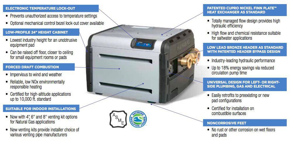 گرمکن گازی استخر هایوارد با اشغال فضای بسیار کم مناسب برای موتورخانه های کوچک و فیلتر خانه استخر های خصوصی و نیمه عمومی میباشد.