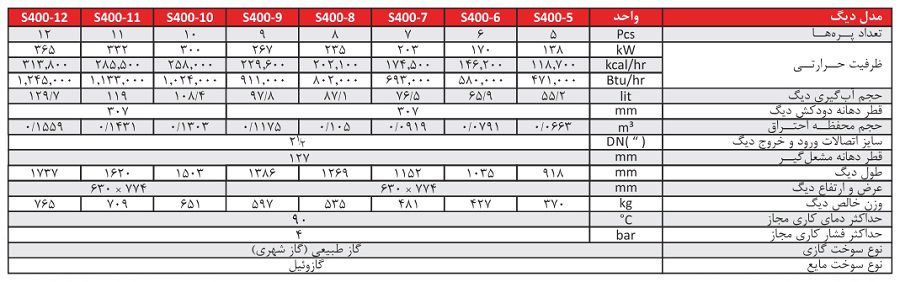 دیگ سوپر ۴۰۰ هشت پره از ساختار تکه ای تشکیل شده و پره های دیگ به صورت جداگانه قابل جابجایی و نصب و راه اندازی میباشند ،به همین دلیل حمل و نقل و نصب و سرویس این دیگ ها به سهولت انجام میشود.این دیگ در مدل ۳ پاس تولید میشوند تا انتقال حرارت بخوبی و با حداکثر میزان خود انجام شود و با وجود لوله های پلی امید آب گرم موردنیاز به صورت یکنواخت در سیستم جاری شود و جهت جلوگیری از اتلاف حرارت بدنه دیگ با روپوش ایزولاسیون محافظت میشود. حجم آبگیری دیگ چدنی سوپر ۴۰۰ با تعداد پره های ۷ عدد به میزان۸۷/۱ لیترمیباشدو با داشتن حجم محفظه احتراق به میزان ۰/۱۰۵ متر مکعب بازدهی خوبی را به مصرف کننده ارائه می نماید.