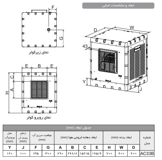 مشخصات فنی و ابعادی مینی کولر آبی آبسال مدل AC33B